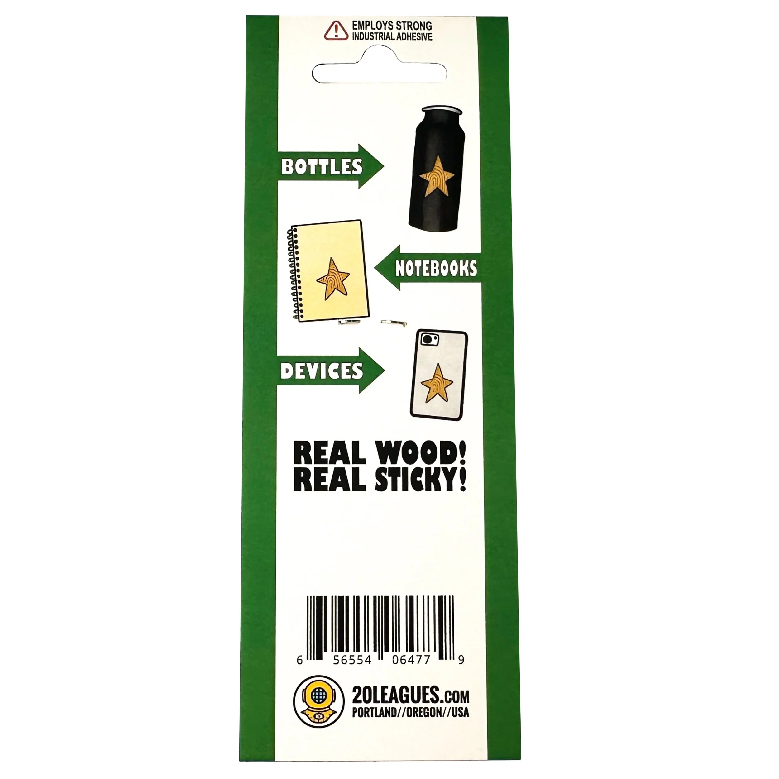 Smartly presented in 2" x 5.5" hang tag packages, Woodstickers are laser cut from real (not synthetic) wood! They look great on water bottles, phone cases, notebooks, or any place you've ever thought to yourself, "Hey! A Wood Sticker would really liven up this place or thing or person!"